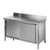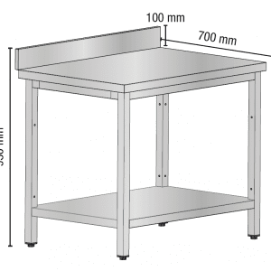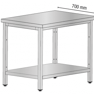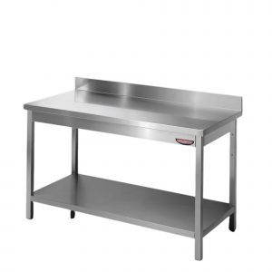 Radni stol izrađen od nehrđajućeg čelika s radnom površinom debljine 40 mm, dostupnom sa ili bez zaštite od prskanja. Stabilna cjevasta konstrukcija s podesivim nogama i donjom policom za dodatnu funkcionalnost. Idealno za profesionalnu upotrebu.